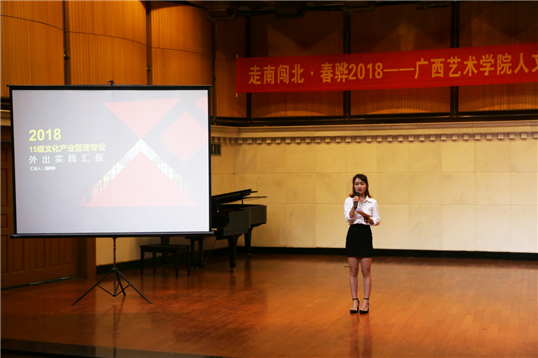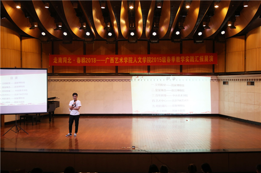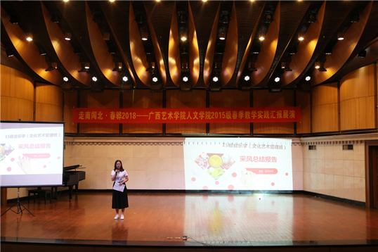 本次汇报展演,首先由公司2015级文化产业管理班、美术学(文化艺术管理)班、艺术史论班、音乐学(文化艺术管理)班的员工代表依次上台分享外出实践的收获及感想,并总结经验,同学们表示今后将把实践经验和专业学习相结合,学以致用,用以促学。其次,各班级带队指导老师曾华、王少杰、杨羽、周游分别对带队班级的外出实践情况进行总结。最后,各班级为本次汇报展演精心准备了丰富多彩的节目表演以及个人才艺展示,现场气氛热烈。同学们演唱的青春情怀歌曲,现场演绎的小品以及表演串烧等节目都展现了人文学子的才华和智慧。在采风摄影优秀的作品展示中,照片拍摄作者分享了照片背后的故事和意义,令同学们受益匪浅。